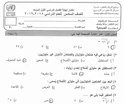 اسئلة اختبار رياضيات سادس ابتدائي الفصل الاول.