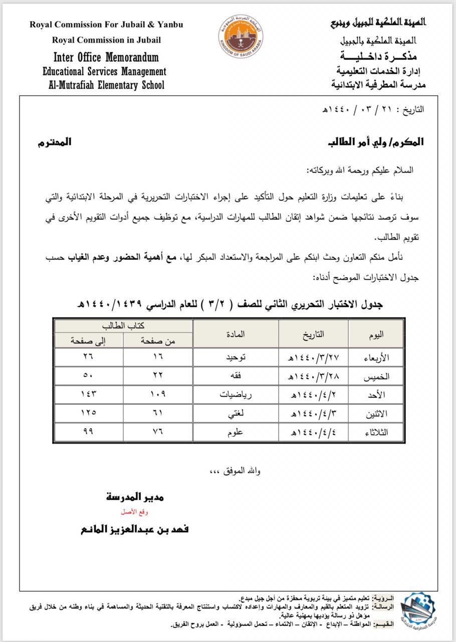 2019 الاختبارات التحريرية للمرحلة الابتدائية 1440.