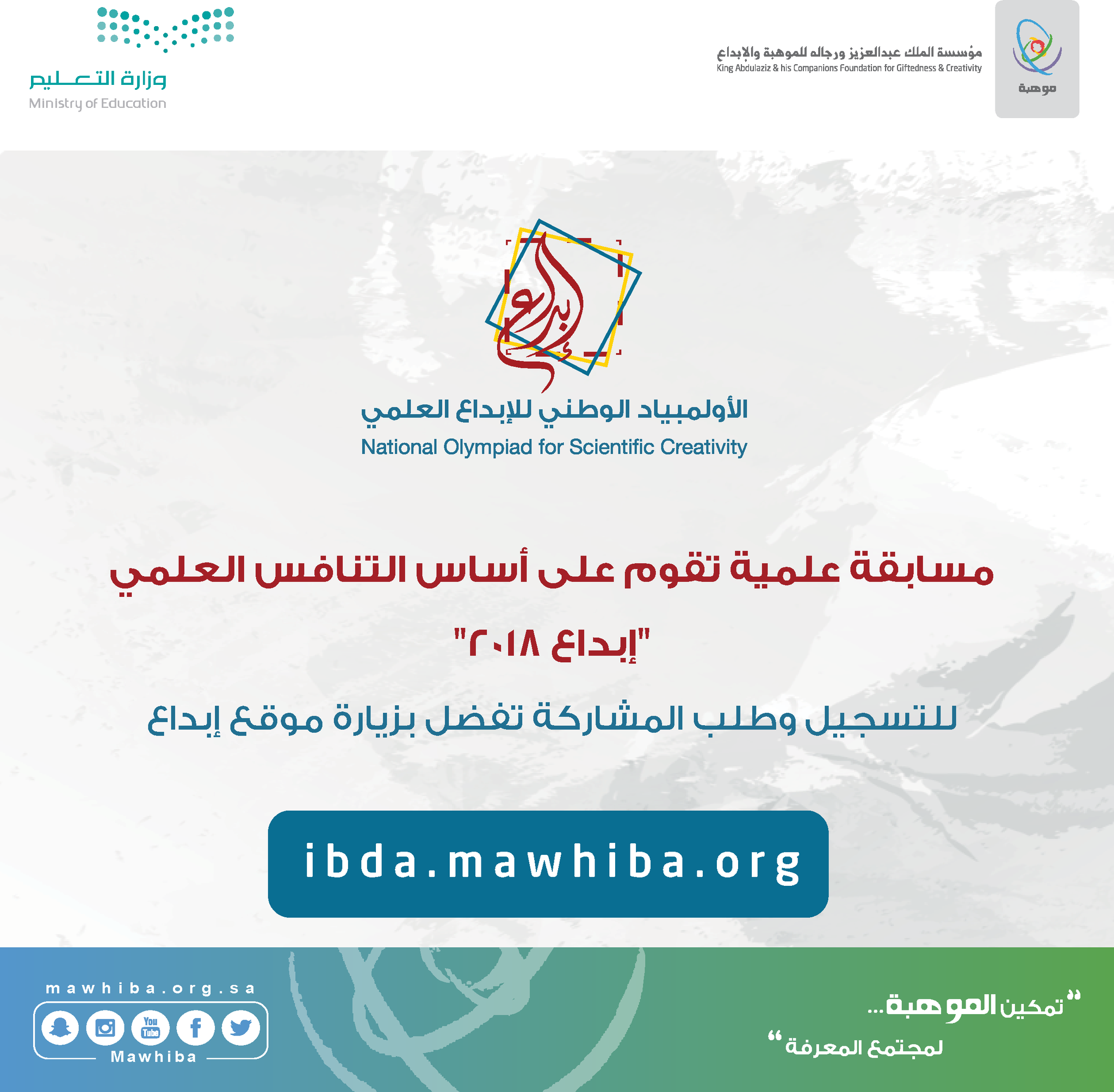 التسجيل في الاولمبياد الوطني للابداع العلمي 2020. الأولمبياد الوطني للإبداع العلمي التسجيل الأولمبياد الوطني للإبداع. أعلنت مؤسسة الملك عبدالعزيز ورجاله للموهبة والإبداع موهبة بالشراكة مع وزارة التعليم فتح باب التسجيل في الأولمبياد الوطني للإبداع العلمي إبداع 2020 حتى 29 سبتمبر المقبل. وتفصيلا دعت مؤسسة موهبة الطلاب. موهبة تفتح باب التسجيل في الأولمبياد الوطني للإبداع العلمي 2020.