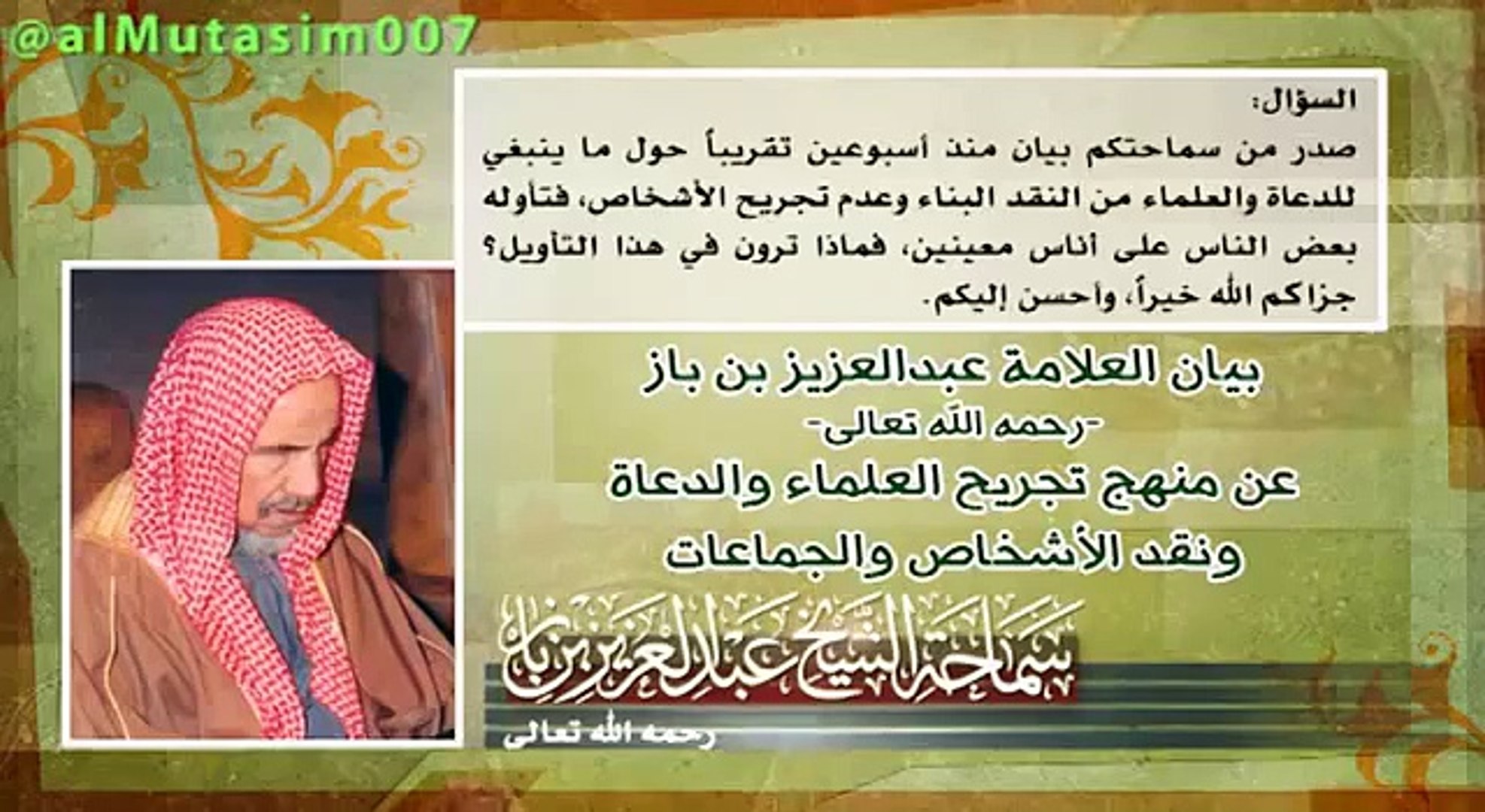 السيرة الذاتية لـ الشيخ عبد العزيز بن باز رحمه الله 1330 ـ 1420هـ اسمه ونسبه ومولده عبد العزيز بن عبد الله بن عبد الرحمن بن محمد بن عبد الله آل باز. ولد الشيخ عبد العزيز بن عبد الله بن باز في مدينة الرياض في الثاني عشر من شهر ذي الحجة عام 1330هـ في بيت علم وفضل وجد في طلب الرزق الحلال عن طريق الزراعة والتجارة. سيره قصيرة عن الشيخ عبدالعزيز بن عبدالله بن باز رحمه الله لغتي الخالدة ثالث متوسط ف1 مشروع الوحدة الثانية اعلام معاصرون متابعينا الكرام من أجلكم أوجدنا هذا الصرح التعليمي الضخم ليفيدكم الأفكار والاستفسارات التي قد. السيرة الذاتية لـ الشيخ عبد العزيز بن باز رحمه الله 1330 ـ 1420هـ اسمه ونسبه ومولده عبد العزيز بن عبد الله بن عبد الرحمن بن محمد بن عبد الله آل باز.